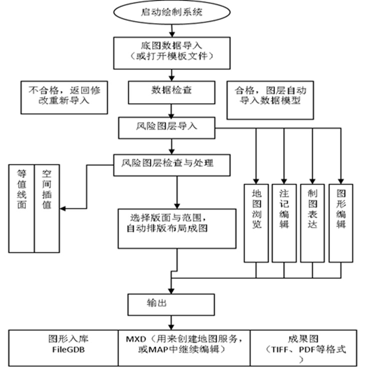 洪水风险图绘制系统中使用了基于地图表达及模型驱动的制图方法,在水利地图数据模型驱动下自动完成数据检查、地图配置、自动排版成图工作。还可进行注记编辑、水工符号智能优化,各类图形要素能根据比例尺选择使用匹配的图式与版面,以标准、专业的图式绘制完成各类洪水风险图制图。制图成果符合标准与规范,提高了制图的自动化、规范化、统一化,是首个专业的水利GIS制图系统。目前已根据相关标准及与规范构建好了完整的水利地图数据模型,包括1:25万、1:5万、1:1万水利工程要素与基础地理要素,除绘制洪水风险图之外,可推广用于整个水利行业GIS制图,促进水利信息化建设中电子地图配置的标准与规范化。系统构架、使用流程及制图成果示例如图2、3、4.