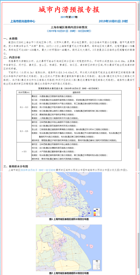 系统以专报文档、专题图、数据表、动画渲染、统计值等多种方式展现研究区域内网格、道路水深的时空分布特点和风险程度大小。尤其是专报文档中全面涵盖水雨情信息、内涝分析结果和积水分布图,成为上海市防汛部门汛期收到气象暴雨预警信息后,及时在其水务公共信息平台发布的专业防汛专报之一,向市级和各区县灾害防御和应急调度决策部门公布。