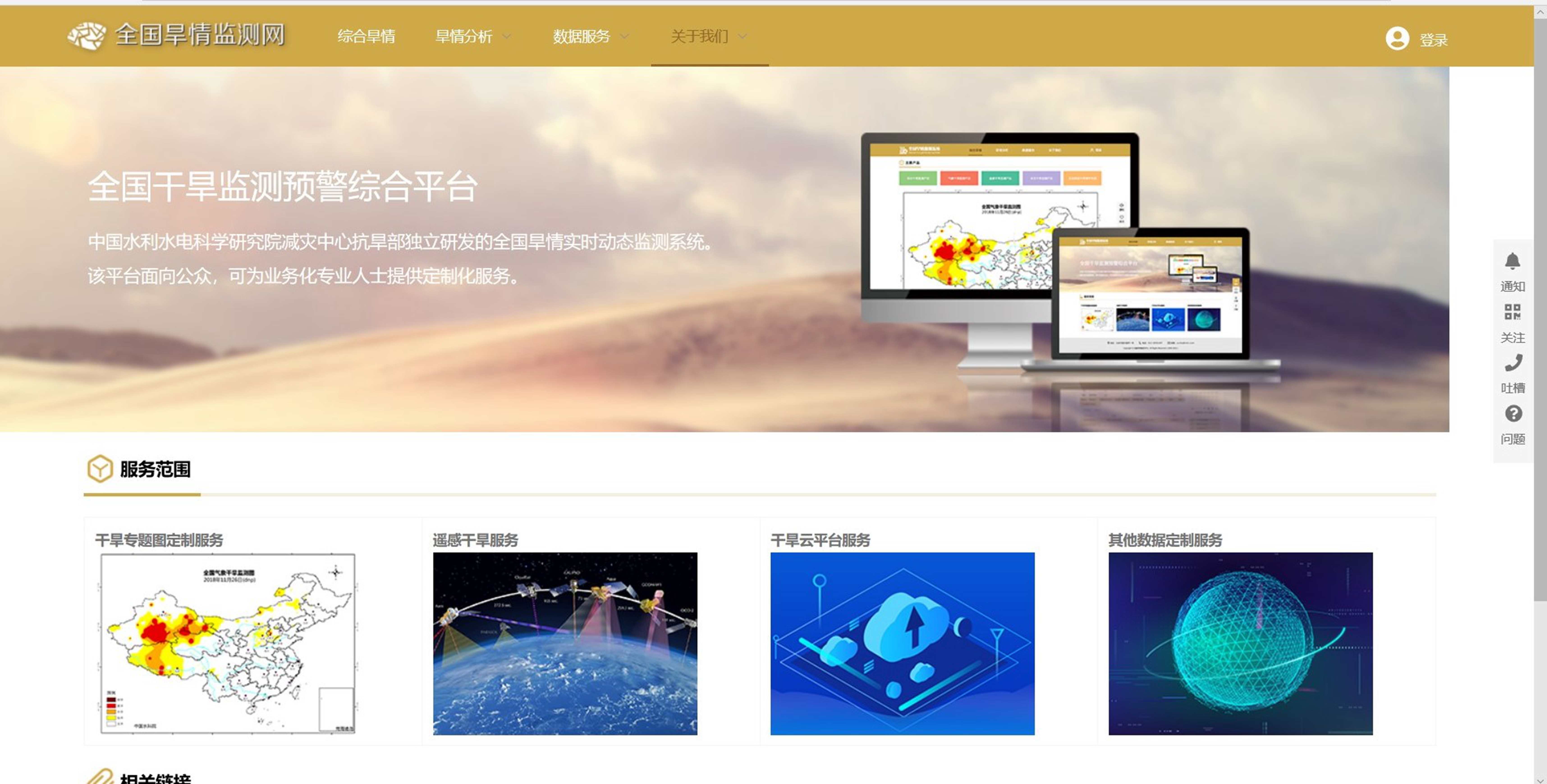 面向各级水利部门、应急部门、自然资源部门、农业农村部门、林业部门、生态环境部门等及相关的企事业单位,提供干旱监测、干旱预警、旱情研判、抗旱决策、节水调水、农业耕作、灌溉管理、旱灾保险等方面的技术方案、信息系统和产品服务。